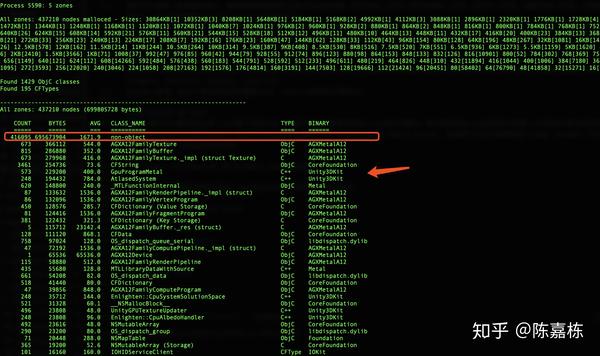 再次,我们可以看到MALLOC_**分配了很多内存。这部分内存主要是调用Malloc进行分配的,其中即包括Unity的原生也就是C++代码的分配也包括第三方库和系统使用Malloc分配的内存,这部分内存在所谓的Heap上,在这几行的后面可以看到“see MALLOC ZONE table below”,也就是可以在下面看到各个heap zone的一个归类。在这里我们可以利用第二个命令行工具heap来检查一下Heap内存的内容。