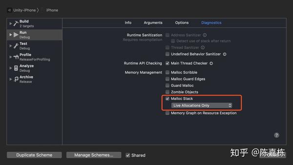 还是以Unity 3D Kit这个工程作为演示,测试设备为iPhone X,不过在开始之前我们首先需要开启Scheme -> Run -> Diagnostics -> Malloc Stack选项。