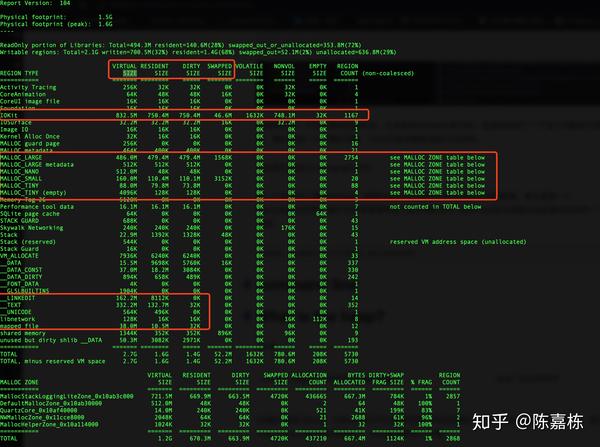 我们可以发现一些有趣的地方。首先有前4列是我们之前讨论过的内容:VIRTUAL SIZE、RESIDENT SIZE、DIRTY SIZE、SWAPPED SIZE。分别表示虚拟内存的大小,映射到物理内存的大小,Dirty内存的大小以及Compressed内存的大小。 我们可以看到TOTAL的部分,这个游戏进程分配了2.7G的虚拟内存其中有1.6G映射到了物理内存上,而DIRTY SIZE的值是1.4G——这个值很接近Memory