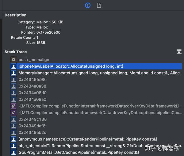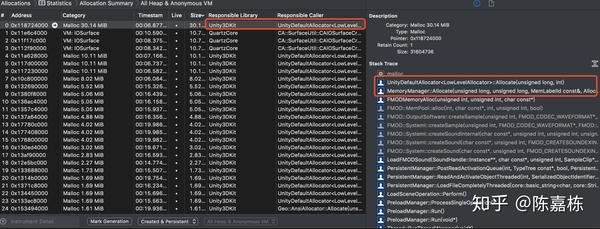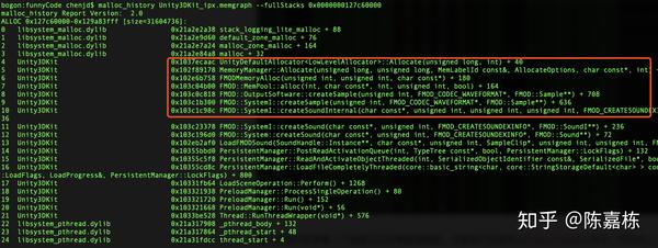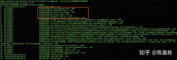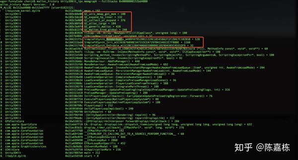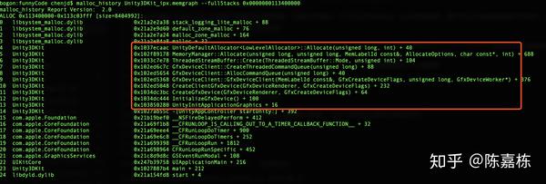 可见,VM_ALLOC这部分内存主要对应了Unity的Mono托管堆的内存而且这个项目的Mono内存并不大。而具体是哪个函数触发了GC分配,则可以通过malloc_history来查看。