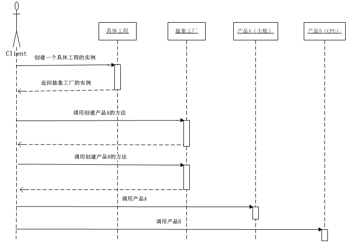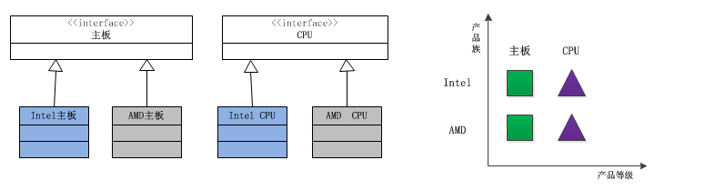 3.同属于同一个产品族的产品是在一起使用的,这一约束必须在系统的设计中体现出来。(比如:Intel主板必须使用Intel CPU、Intel芯片组)