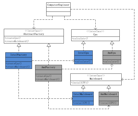上面的实现,虽然通过简单工厂方法解决了:对于装机工程师,只知CPU和主板的接口,而不知道具体实现的问题。但还有一个问题没有解决,那就是这些CPU对象和主板对象其实是有关系的,需要相互匹配的。而上面的实现中,并没有维护这种关联关系,CPU和主板是由客户任意选择,这是有问题的。