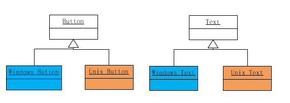 可以发现在上面的产品类图中,有两个产品的等级结构,分别是Button等级结构和Text等级结构。同时有两个产品族,也就是UNIX产品族和Windows产品族。UNIX产品族由UNIX Button和UNIX Text产品构成;而Windows产品族由Windows Button和Windows Text产品构成。