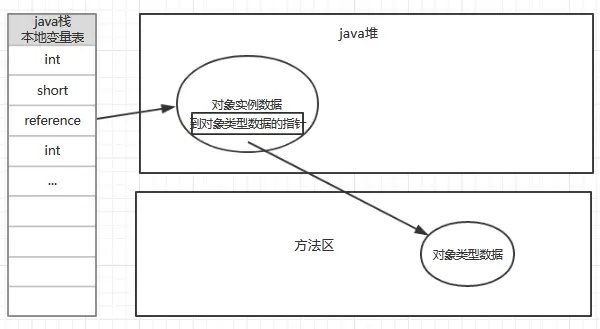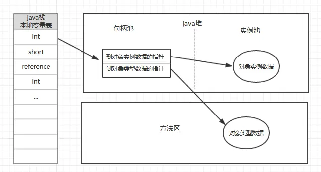 在上一章的内存结构中我们有提到,虚拟机栈会存储方法的执行过程中的局部变量表,如果变量为对象的话,栈中存储的就是该对象的引用,而具体的对象则被创建在堆当中,对象所对应的类信息则存储在方法区。在java程序中需要通过栈上reference数据来操作堆上的具体对象。对象访问的方式则取决于虚拟机实现来决定。目前主要有使用句柄和直接指针两种类型。