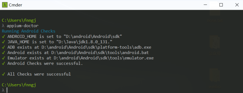 注:如果提示:“appium-doctor”不是内部或外部命令,找到Appium的安装目录,例如: