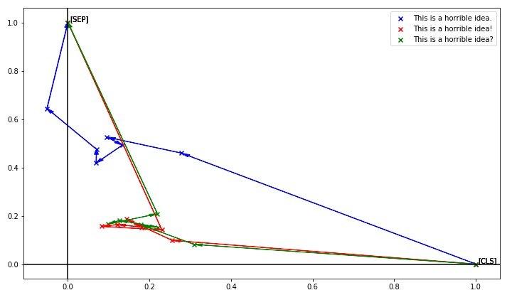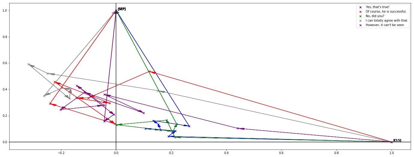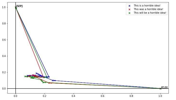 小哥用上一种方法,把[CLS]投影到(1,0),[SEP]投影到(0,1),每个点是一个词,用箭头表示顺序,得到了下图: