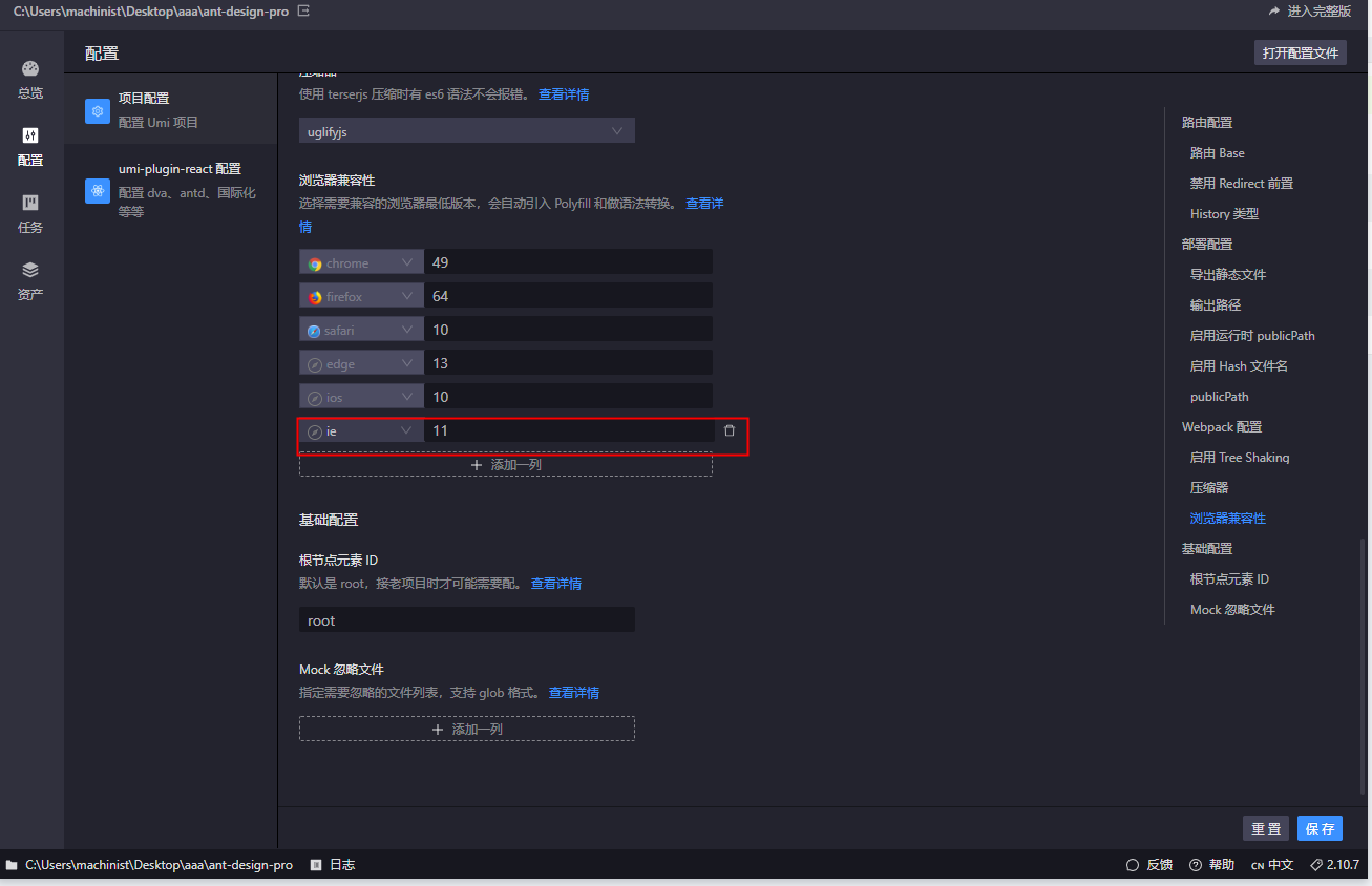 做一个简单的测试,修改一下浏览器兼容性的配置,从IE11改到IE9,看看项目中的配置文件是否会相应的修改;