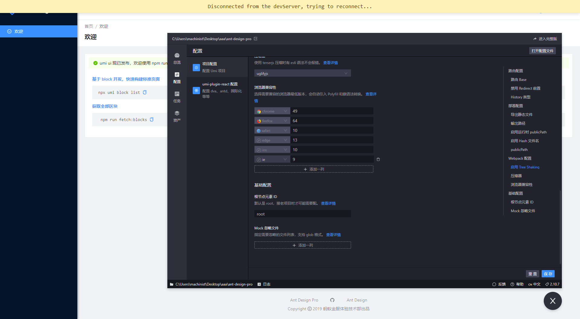 点开配置tab,里面有关于热更新、dva、路由以及静态数据的相关的配置,可以不在配置webpack;