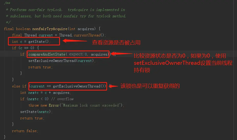 - 非公平模式(默认) - 主张竞争获取,可能会延缓一个或多个读或写线程,但是会比公平锁有更高的吞吐量 - 非公平获取锁详情如下: