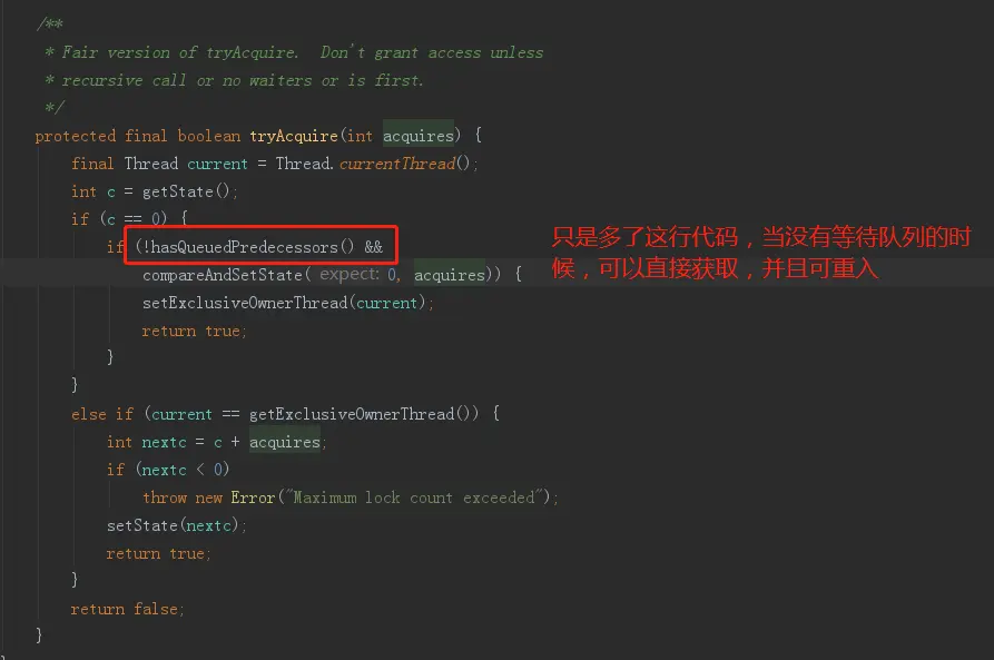 java.util.concurrent.locks.Lock 方法中tryLock(time,unit)等待获得锁 java.util.concurrent.locks.ReentrantLock 构造函数中会传入bool值,根据这个bool值会影响是否加公平锁,公平锁加上之后,会进入队列,不加公平锁会先抢占资源,然后进入队列。 ReentrantLock 可重入锁,当一个线程请求得到一个对象锁后再次请求此对象锁,可以再次得到该对象锁,就是说在一个synchronized方法/块的内部调用本类的其他synchronized方法/块时,是永远可以拿到锁.