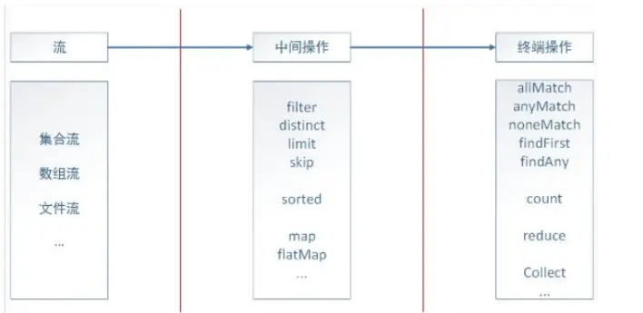Stream的流式处理可以分为三个部分:转换成流、中间操作、终端操作,如下图: