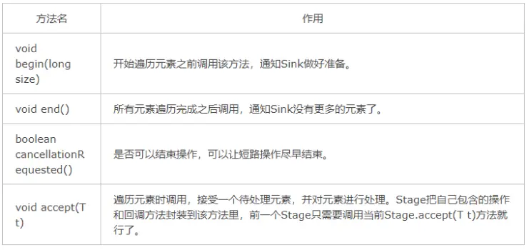现在我们知道Stream()是如何记录每一步的操作了,要想让流水线将所有的操作叠加在一起,还需要有一种协议来协调相邻的Stage之间的关系。这个协议就是Sink接口,Sink接口方法如下: