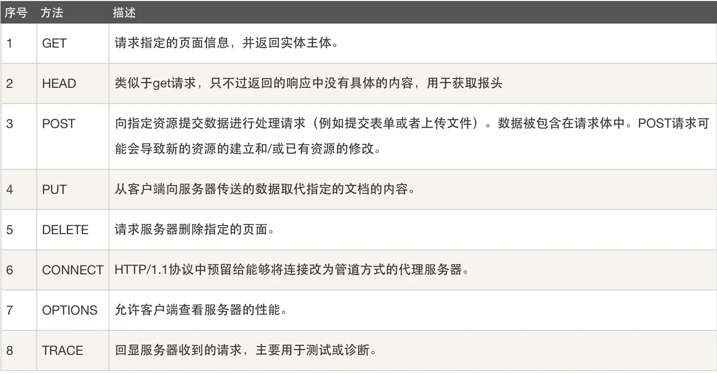 目前使用最广泛的HTTP1.1版本,支持以下几个请求方法: