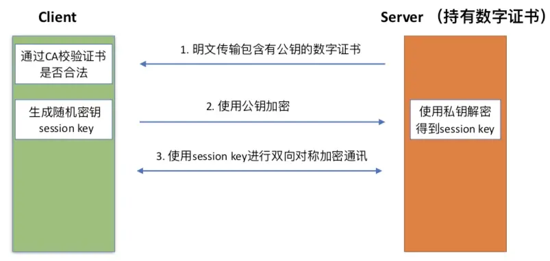 | 方案3 | 基于CA 和⾮非对称加密算法 | 优点: 1.因为校验证书的存在,防止了中间人攻击; 2.使用证书中的公钥完成非对称加密,保证数据安全; |