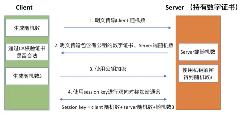 | 方案4 | 基于⽅方案3,增加session key复杂度 | 缺点: 1.客户端与服务器在加密算法选择、算法实现等选择上,兼容性不好; |