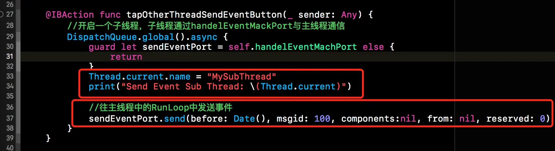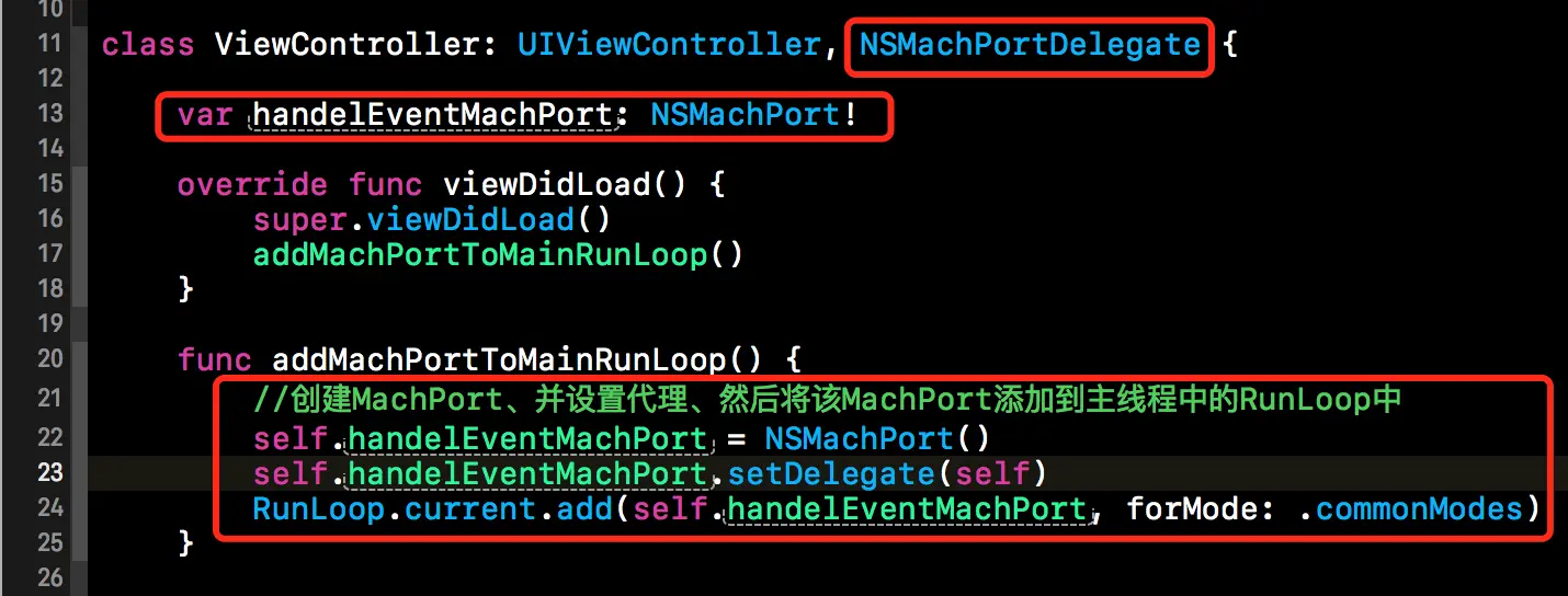 接下来我们就通过一个小的示例来简单的看一下MachPort的使用方式。首先我们声明了一个NSMachPort的成员属性handelEventMachPort,该变量实例化后指定其NSMachPortDelegate的对象为当前类。然后将handelEventMachPort添加到主线程中,具体代码如下所示。