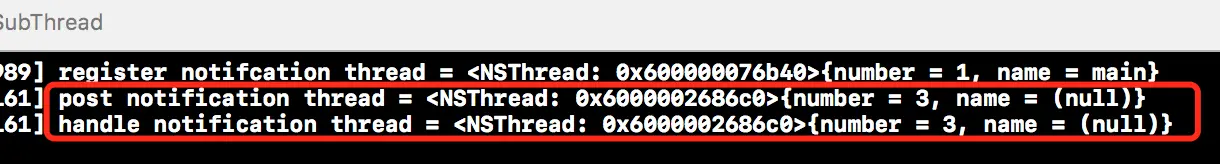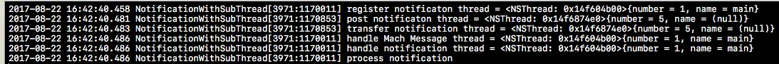 实现完上述代码后,下方是上述代码的运行结果。从结果中我们不难发现,虽然是在主线程中添加的观察者,但是如果在子线程中发出通知,那么就在该子线程中处理通知所关联的方法,具体效果如下所示: