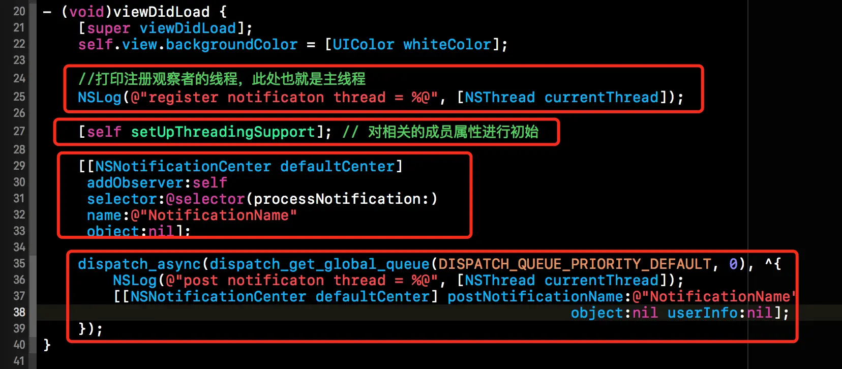 下方就是本部分的核心代码,代码比较简单。首先我们打印出注册观察者的线程,然后往通知中心添加观察者。紧接着我们就创建一个子线程,然后对子线程的信息进行打印并获取通知中心单例发送通知。
