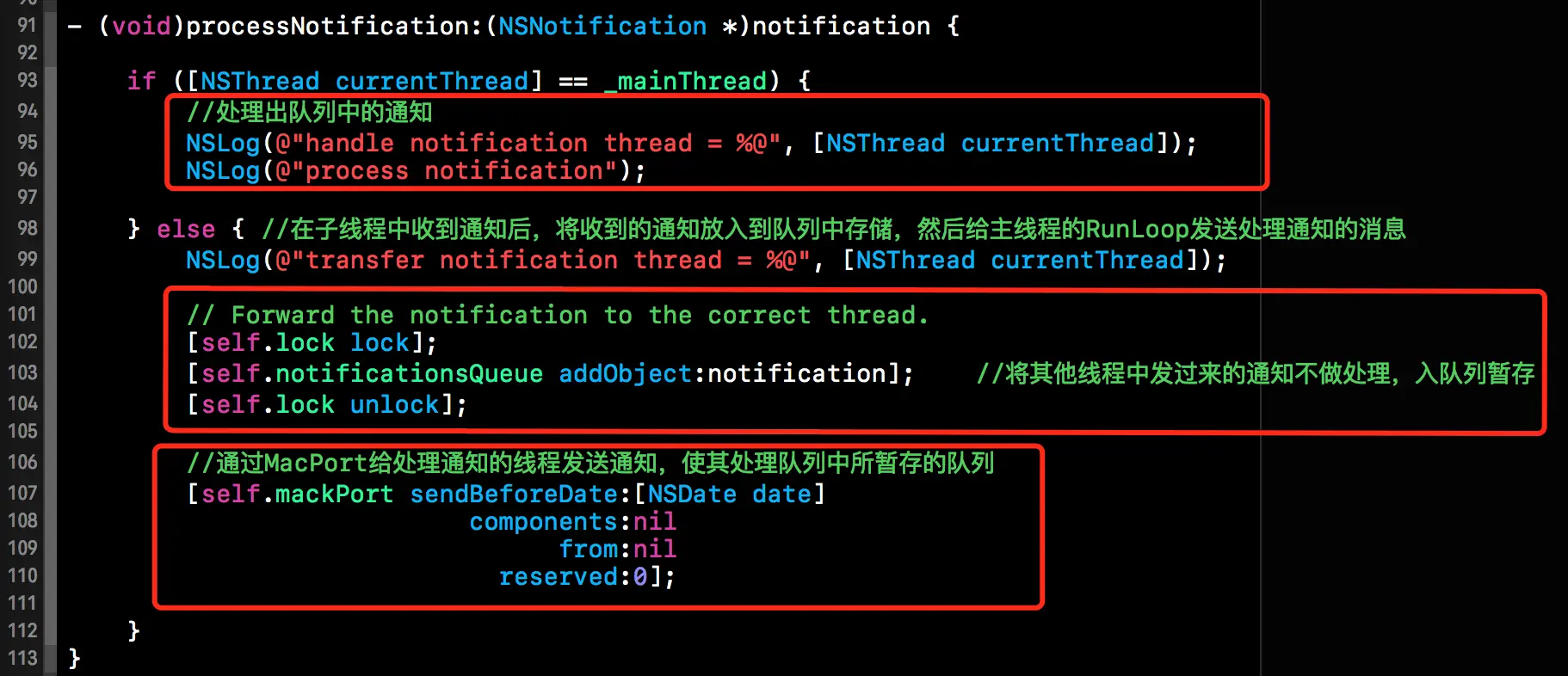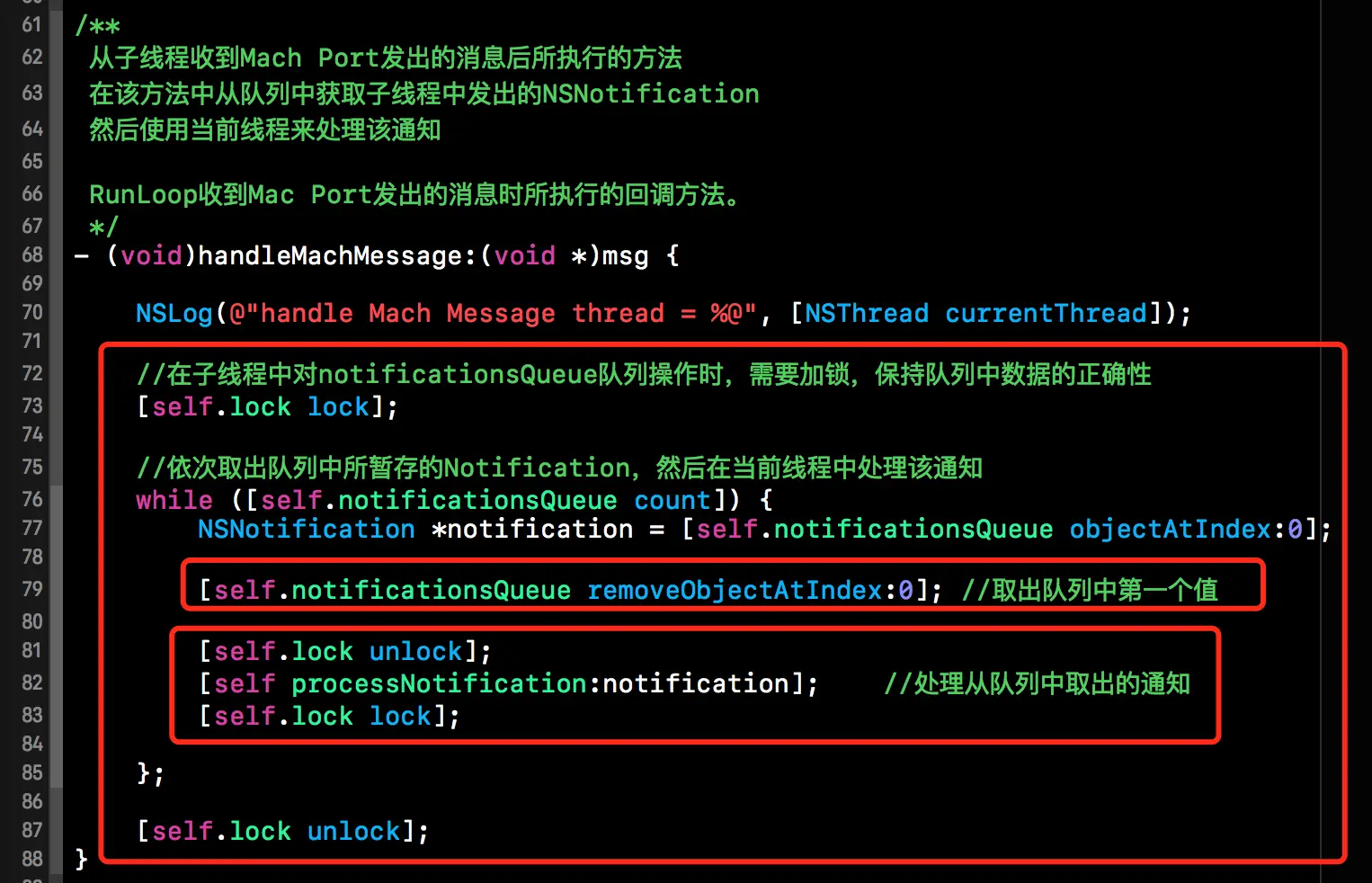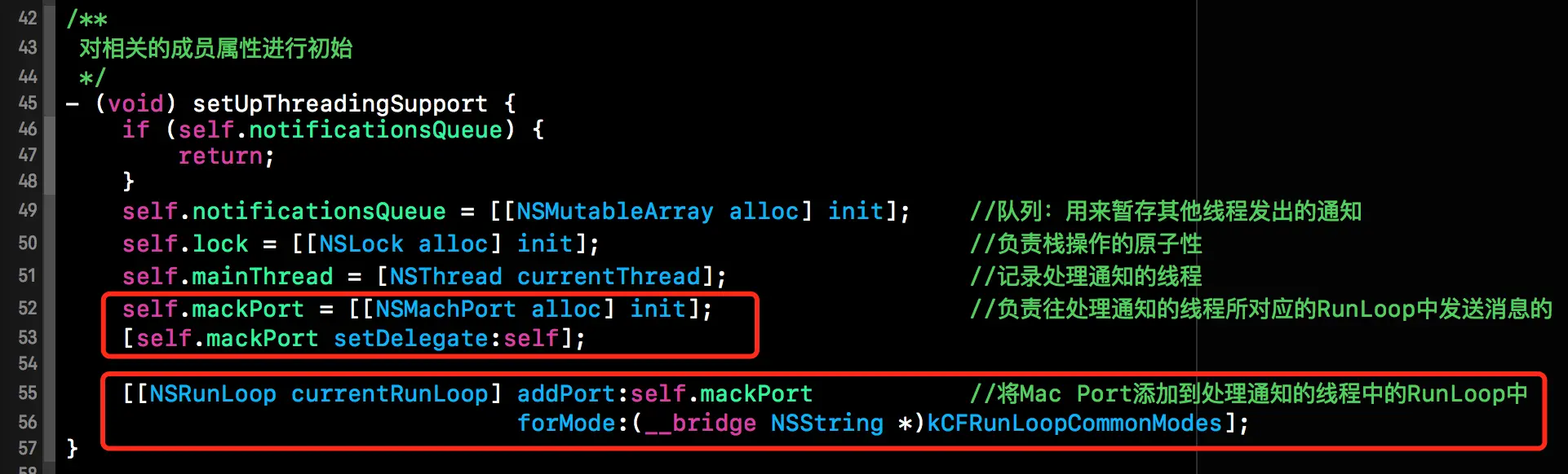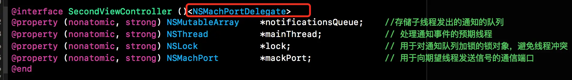首先还是得实现NSMachPortDelegate相关协议中的方法,下方代码段中的notificationQueue用来纯粹子线程发出的所有通知,mainThread则是用来储存主线程了,lock则是对通知队列加锁,避免多个线程同时操作该队列所出现的数据不一致问题。mackPort则是用于向期望线程发送信号的通信端口。