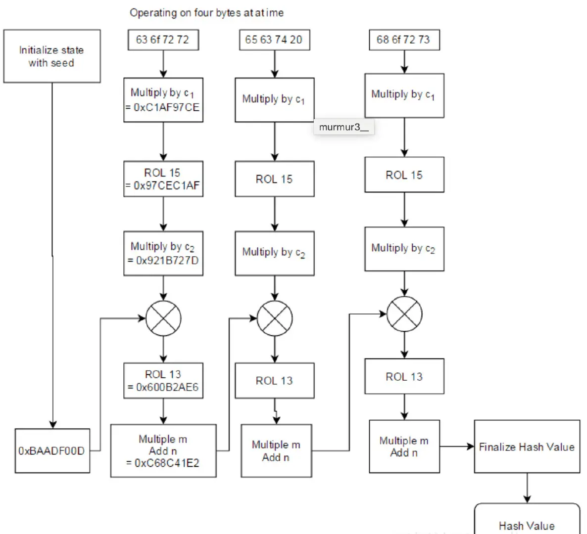 - Hash 函数使用 Murmur3,Murmur3 是非加密散列函数,不适用于加密目的,其流程和实现如下