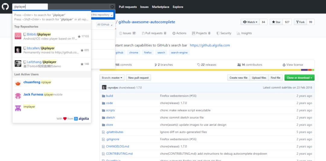 有没有更简单快捷的操作方法?当然,GitHub Awesome Autocomplete 就可以帮到你。这款插件能够让你在 GitHub 中输入关键字之后通过弹窗动态显示相应的搜索结果,你所需要做的,只是点击即可。
