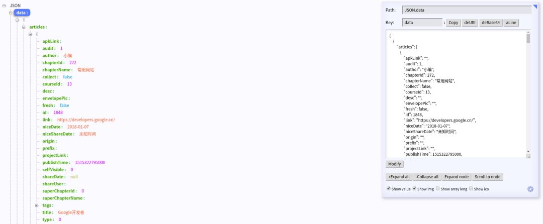 安装完 Json-Handle 之后,看下图,是不是瞬间清爽很多。它自动帮你排列好 json 数据,直观大方,简直就是开发者必备。