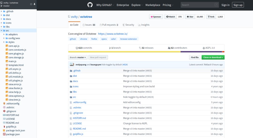 这时候 Octotree 这款插件就很强大了,它会自动在 Chrome 侧边栏生成项目目录结构,你可以在侧边栏随意切换,简直不要太爽。