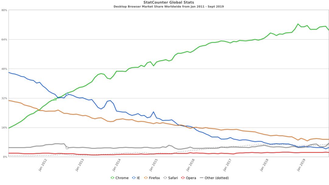 在网站通讯流量监测机构 StatCounter 上看了一下各大浏览器的市场份额, Chrome 继续巩固了自己在老大的位置,截止目前,Chrome 的市场份额占到 70% 左右,而且还在呈现上升的趋势。