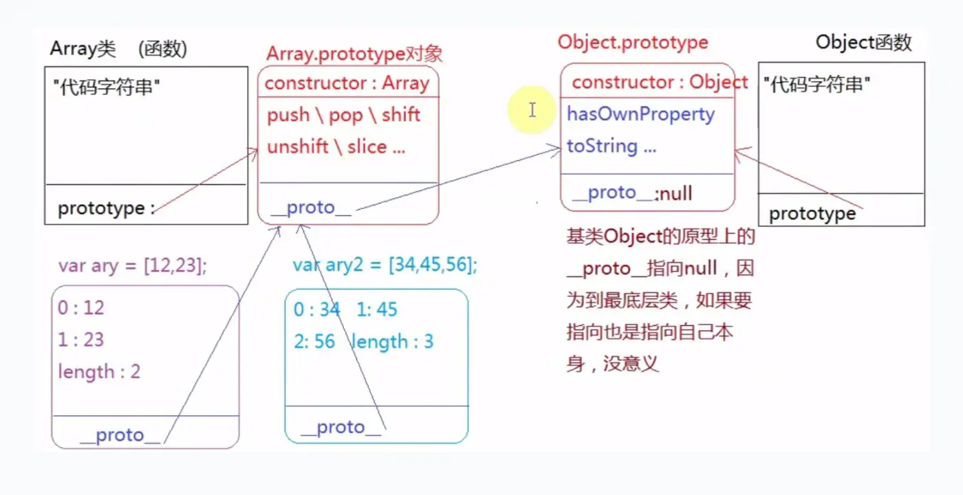 每一个函数数据类型(普通函数、类)天生自带一个prototype属性,它的属性值是一个对象数据类型;prototype的属性值天生自带一个constructor属性,constructor的属性值指向当前原型所属的类;每一个对象数据类型天生自带一个__proto__属性,它的属性值指向当前实例所属类的原型;(如果不能确定它是谁的实例,都是Object的实例)