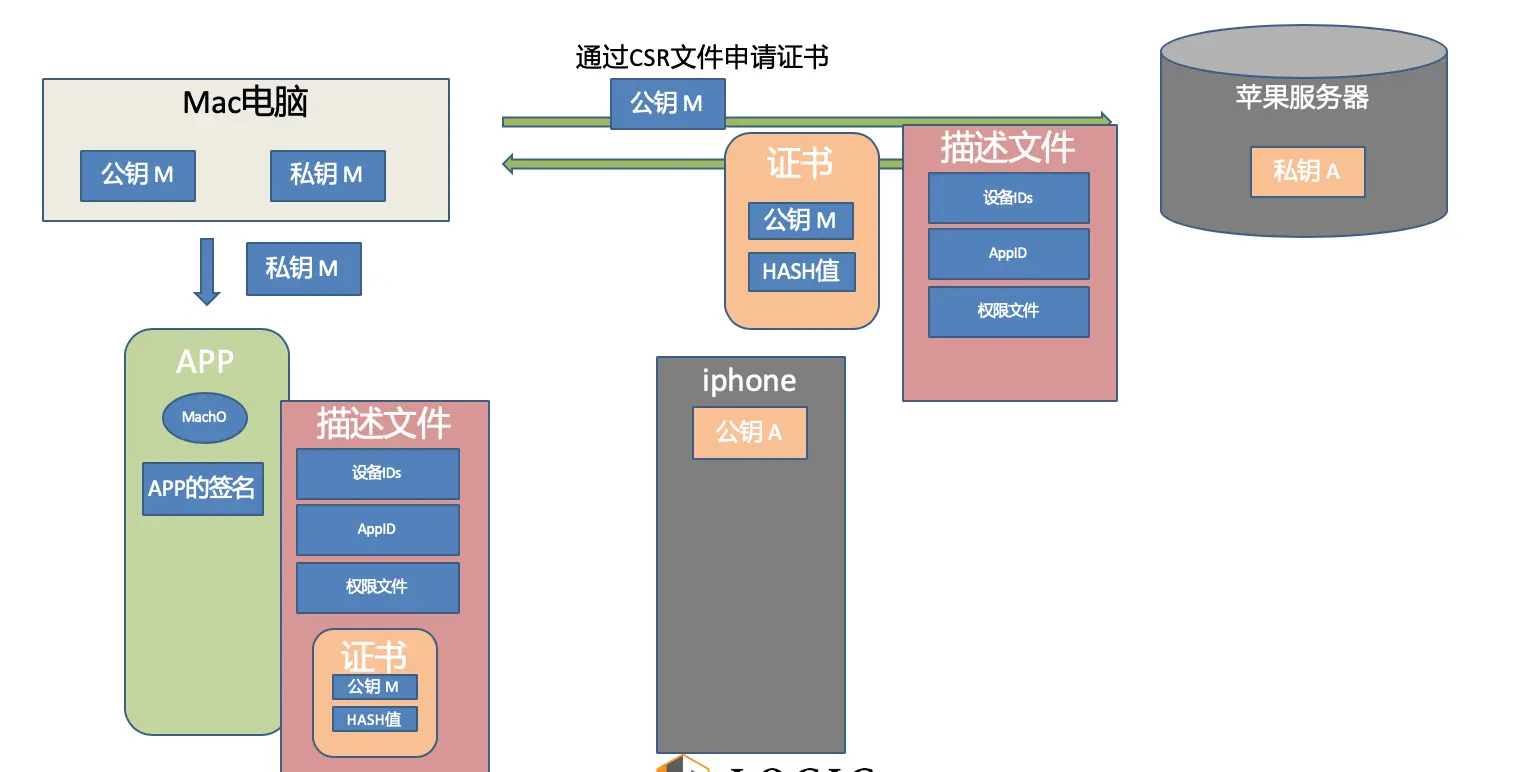 2、苹果本身也有一对密钥,服务器通过私钥对Mac的公钥进行加密,并携带一些其他信息(服务器配置的设备ID ,AppID 权限文件等),通过开发者证书的形式回传给电脑