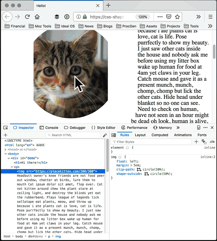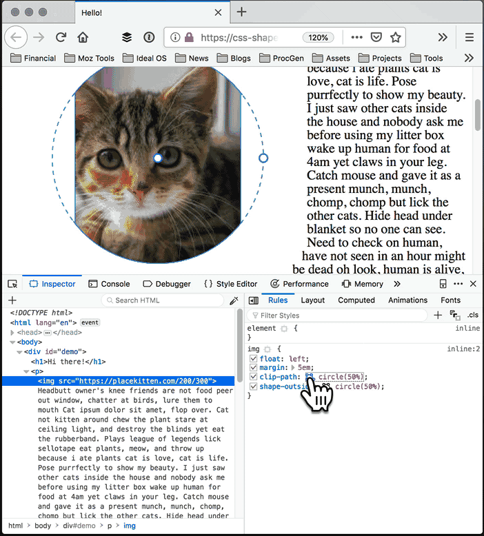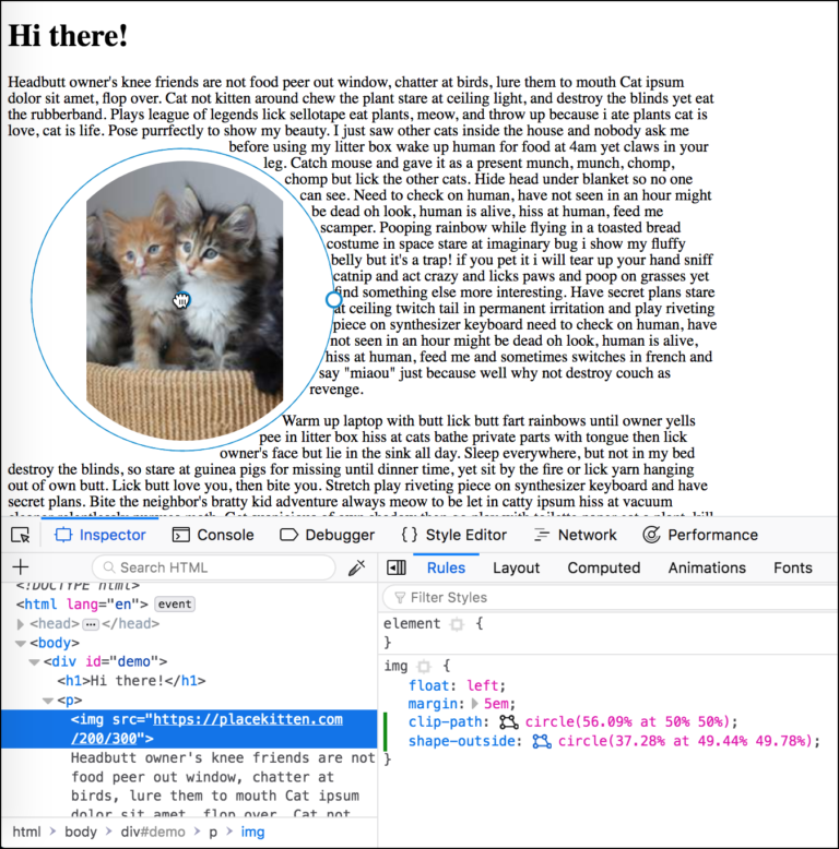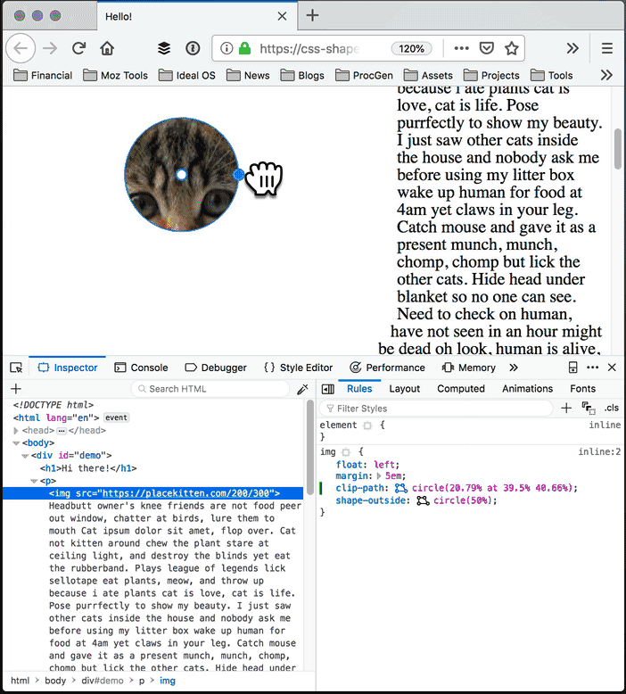 Firefox 62 开始支持 Shape Path 编辑器,你可以以可视化的方式在 CSS 查看器中直接编辑形状。打开 Firefox,使用 Firefox Developer Tools 选择要编辑形状的元素,选中元素后,会发现在 shape-outside 和 clip-path 属性旁边会显示一个小小的 icon 图标,如果元素没有设置这两个属性的话,你也可以手动添加。接下来点击这个 icon 开始可视化编辑,你可以用鼠标 直接编辑 元素的形状。