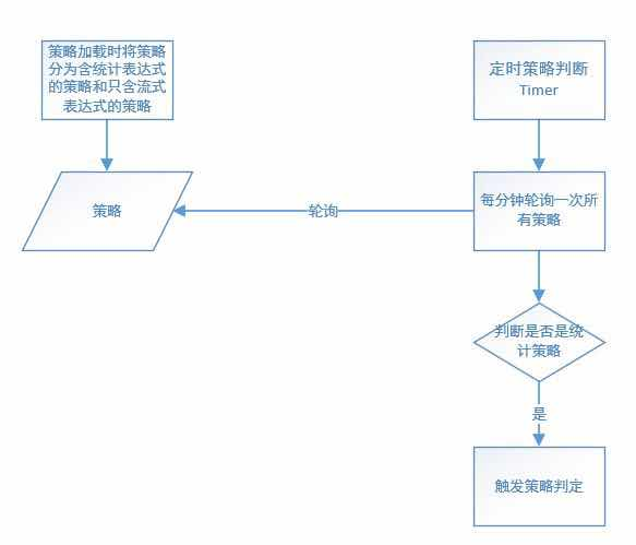 同环比预警属于统计预警的一种,所以同环比的预警流程就是统计预警的预警流程,预警模块启动一个用于统计策略判定的Timer,每分钟(因为统计表达式的时间都是以分钟为单位,所以每分钟轮询一次即可)轮询一次策略,并触发统计策略的判定。