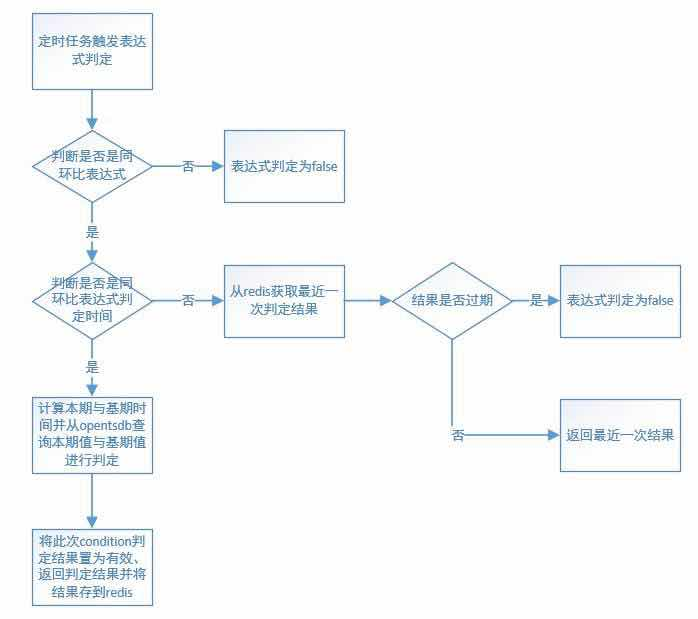 当最小判定元condition内只有统计表达式时,遍历判定各统计表达式,首先会判定是否是统计表达示的判定时间,同环比表达式根据属性值time_from,time_to和环比间隔或同比周期来确定。若不是判定时间,考虑到多个统计表达式的组合判定情况时,各表达式的判定时间可能不一致,我们会取出缓存中上次的未过期的判定结果返回。若是判定时间,则进行同环比计算判定,构造opentsdb查询语句调用API查询本期值与基期值,计算得出同/环比值(率),并与阈值进行比较得出判定结果,结果会缓存到redis,这里也会将此condition的判定置为有效,因为如果condition里的表达式都未达到判定时间,这次判定其实是无效的。