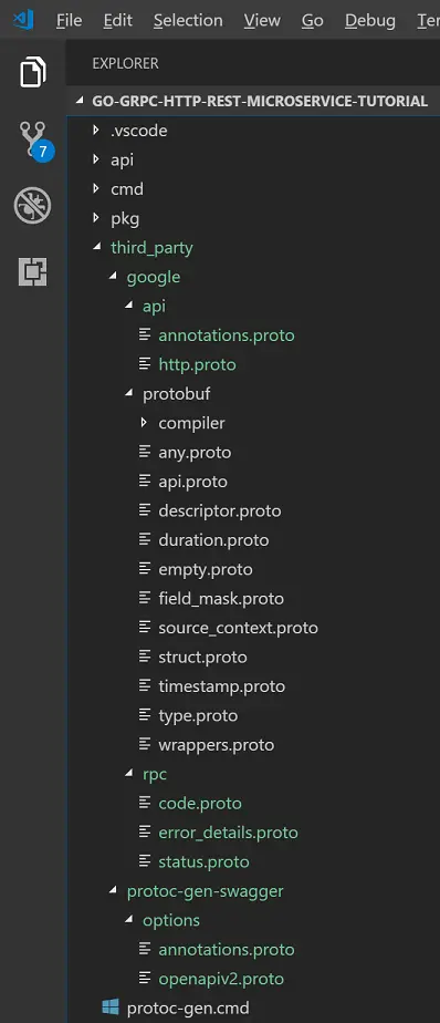 grpc-gateway会被安装在GOPATH/src/github.com/grpc-ecosystem/grpc-gateway文件下。我们需要将里面的third_party/googleapis/google文件拷贝到我们目录的third_party/google下,并且创建protoc-gen-swagger/options文件夹在third_party文件夹内