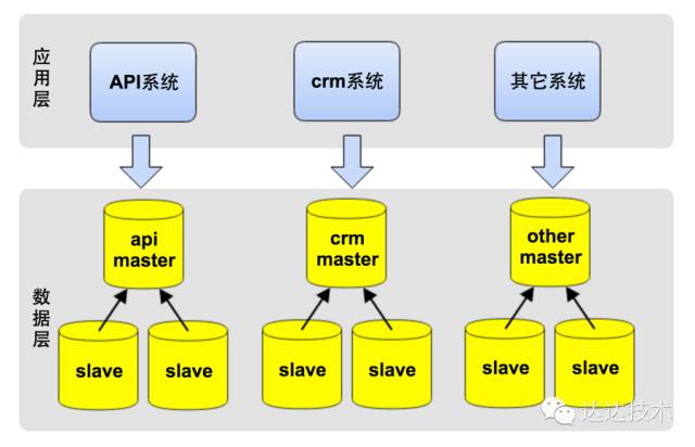 同时,业务越来越复杂,多个应用系统使用同一个数据库,其中一个很小的非核心功能出现Slow query,常常影响主库上的其它核心业务功能。我们有一个应用系统在MySql中记录日志,日志量非常大,近1亿行记录,而这张表的ID是UUID,某一天高峰期,整个系统突然变慢,进而引发了宕机。监控发现,这张表insert极慢,拖慢了整个MySql Master,进而拖跨了整个系统。(当然在mysql中记日志不是一种好的设计,因此我们开发了大数据日志系统,敬请关注本博客后续文章。另一方面,UUID做主键是个糟糕的选择,在下文的水平分库中,针对ID的生成,有更深入的讲述)。这时,主库成为了性能瓶颈,我们意识到,必需得再一次做架构升级,将主库做拆分,一方面以提升性能,另一方面减少系统间的相互影响,以提升系统稳定性。这一次,我们将系统按业务进行了垂直拆分。如下图所示,将最初庞大的数据库按业务拆分成不同的业务数据库,每个系统仅访问对应业务的数据库,避免或减少跨库访问。