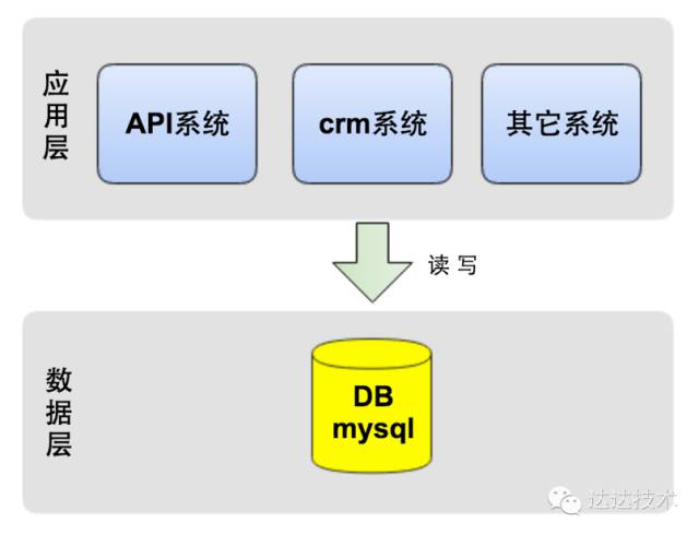 作为创业公司,最重要的一点是敏捷,快速实现产品,对外提供服务,于是我们选择了公有云服务,保证快速实施和可扩展性,节省了自建机房等时间。在技术选型上,为快速的响应业务需求,业务系统使用python做为开发语言,数据库使用Mysql。如下图所示,应用层的几大系统都访问一个数据库。