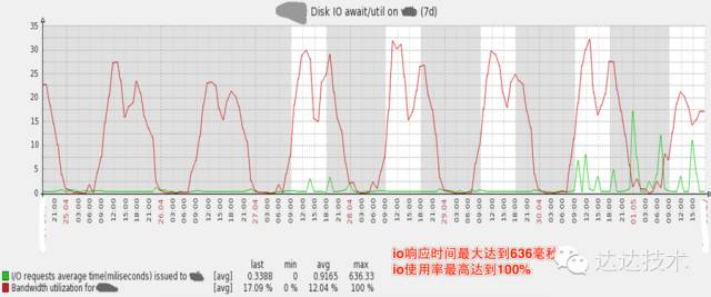 下图是数据库主库的压力, 可见磁盘IO使用率已经非常高,高峰期IO响应时间最大达到636毫秒,IO使用率最高达到100%。