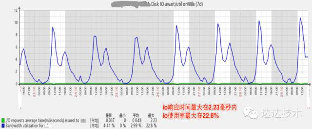 下图是垂直拆分后,数据库主库的压力,可见磁盘IO使用率已降低了许多,高峰期IO响应时间在2.33毫秒内,IO使用率最高只到22.8%。