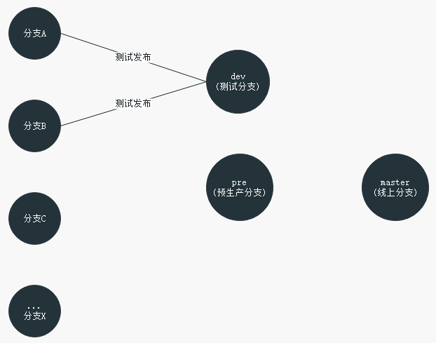 可能分支A, 分支B, 分支C等分支只需要部分上测试分支, 这时可以将部分分支合并到dev分支上, 然后项目根据dev分支, 发布一个测试环境给测试同学去测就好了.