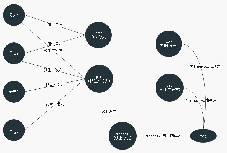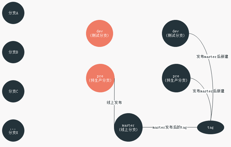 - 发布后打出一个tag,此tag是为线上最新稳定版代码,可以作为其他分支的最新依据