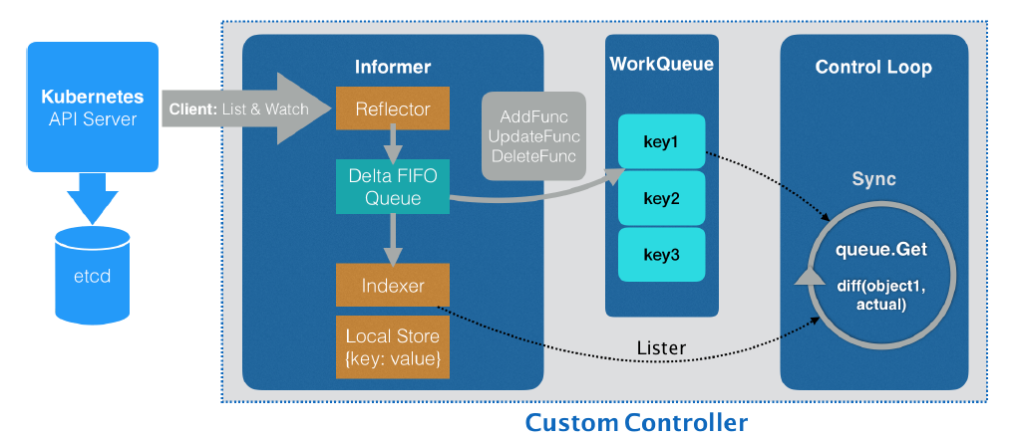 后面的控制循环,则会不断从工作队列中拿到API对象的Key,然后到缓存中去查询对应的API对象。执行真正的控制逻辑。