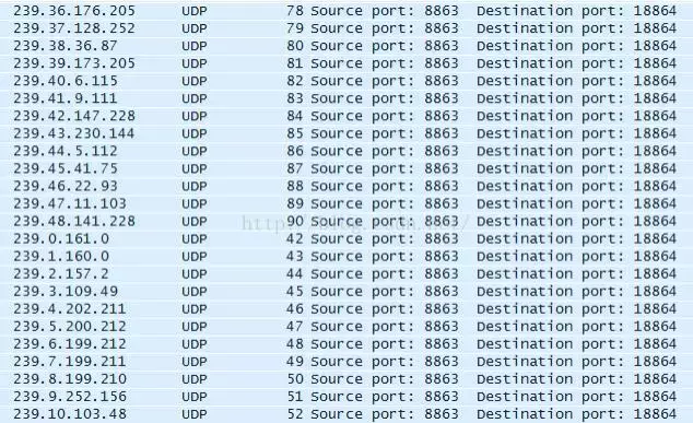 除了用长度携带数据之外还可以利用UDP组播。UDP组播的地址实际上是一个范围,向该范围中任意的IP地址发送数据都能实现组播的效果,而IP中后面的3个字节可以用来携带数据。通常的做法是用第二个字节表示UDP包的顺序,后面两个字节携带实际数据,这种方式还不用考虑路由器加密的问题。如下所示。