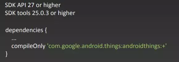 第一步是新建Android Studio工程,SDK API版本要高于27,工具版本高于25.0.3。因为标准的SDK中没有Android things的API,所以要通过脚本的形式集成开发套件。