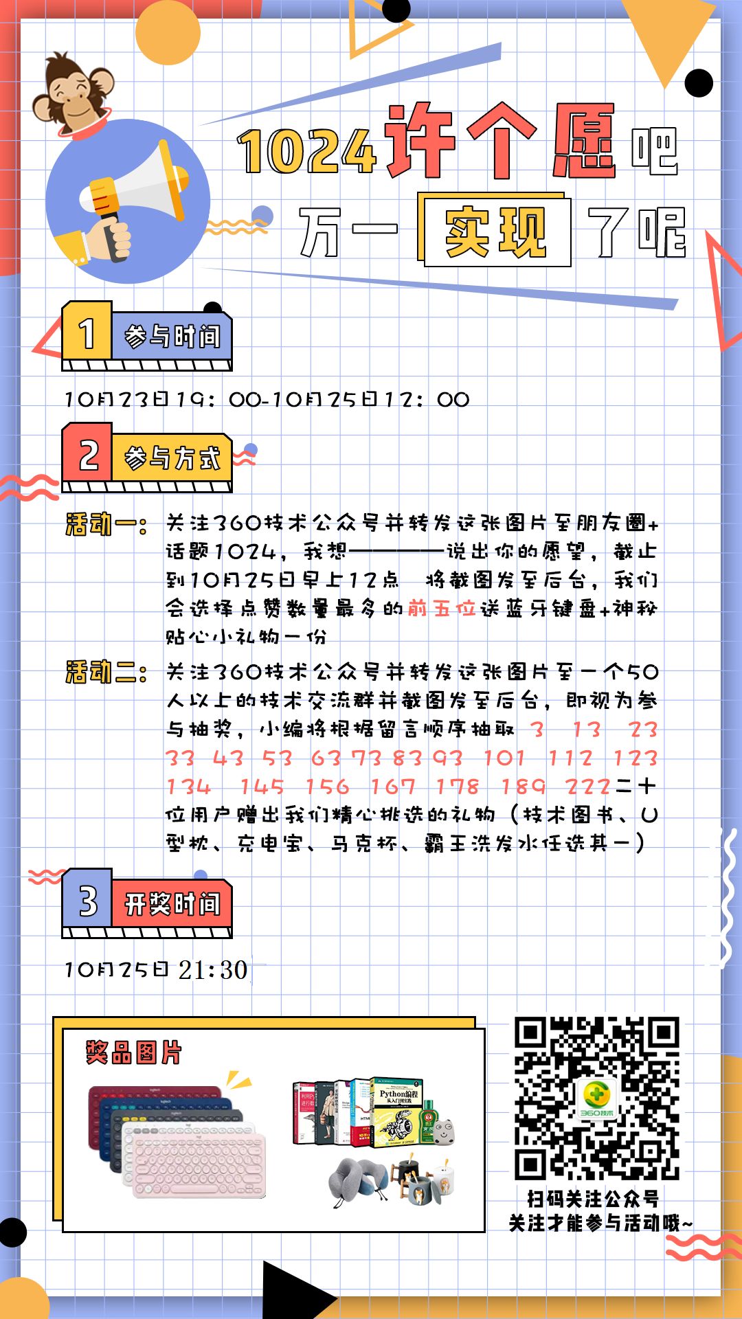 关注360技术公众号并转发下方这张海报至朋友圈+话题#1024,我想————# 说出你的愿望,截止到 10月25日中午12点将截图发至后台,我们会选择点赞数量最多的前五位 送出蓝牙键盘+神秘贴心小礼物一份