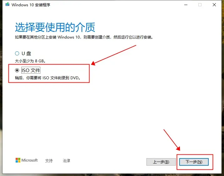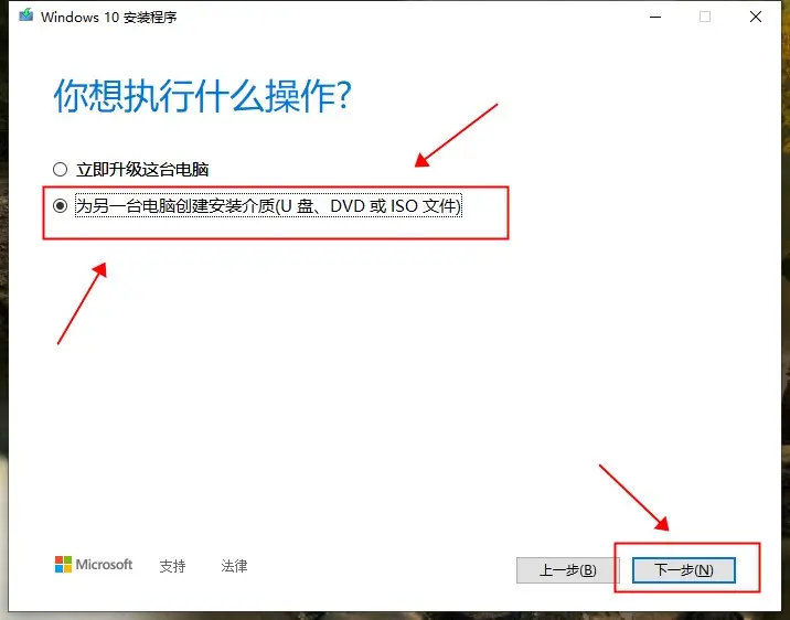 点击“为另一台电脑创建安装介质(U盘、DVD、或IOS文件)”,并选择“下一步”