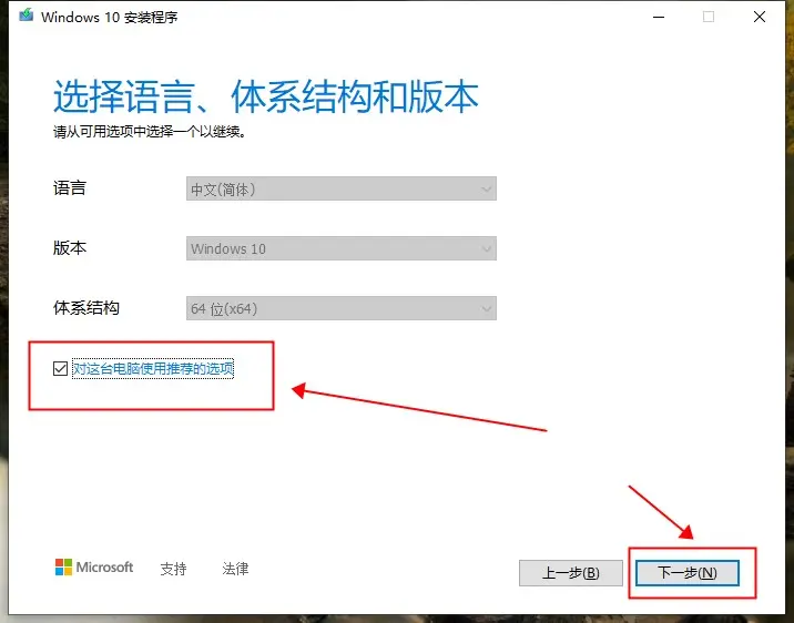 根据自己的需求,选择“语言”、“版本”、“体系结构” 或者直接选择 “对这台电脑使用推荐的选项” ,然后点击“下一步”