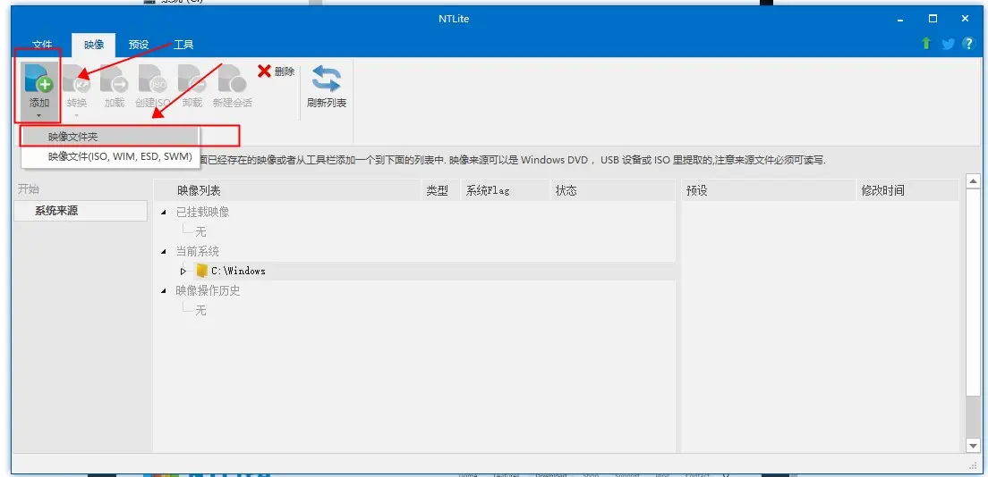 打开精简工具,点击“添加”,选择“映像文件夹”