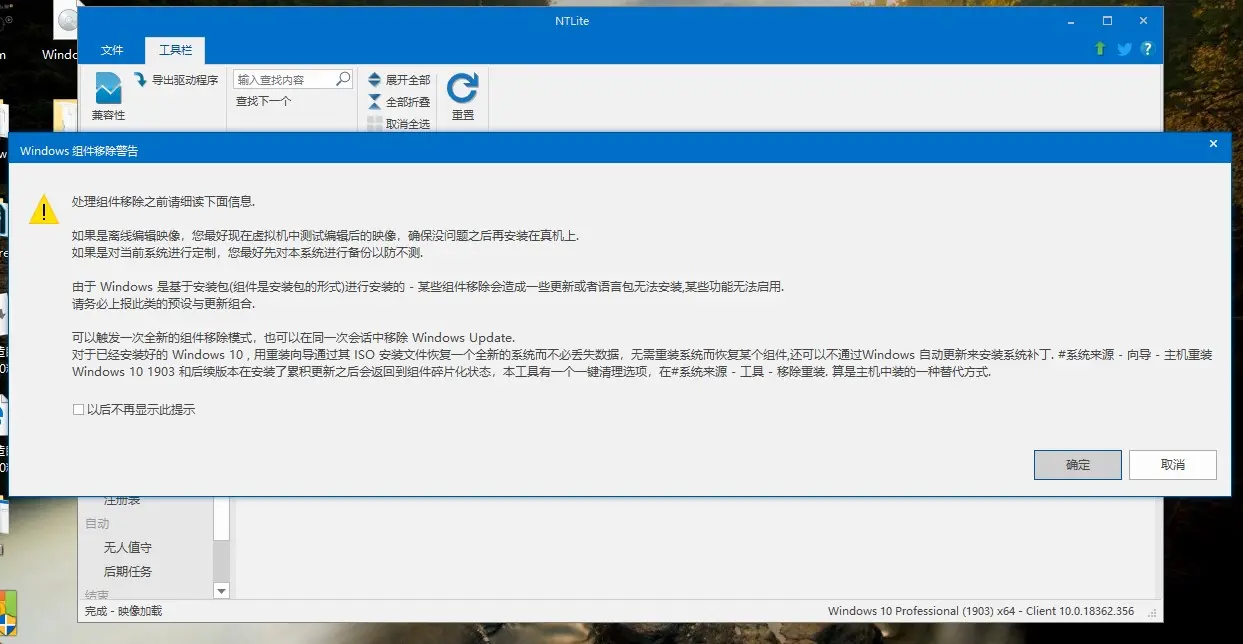 点击“组件移除”,会弹出一个警告框,可以自行仔细阅读,然后点击“确定”