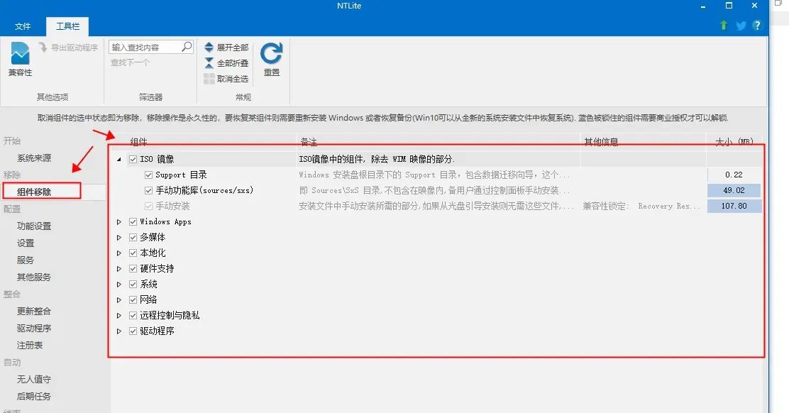 接下来我们可以看到系统自带的组件,”IOS镜像“组件是不建议操作的