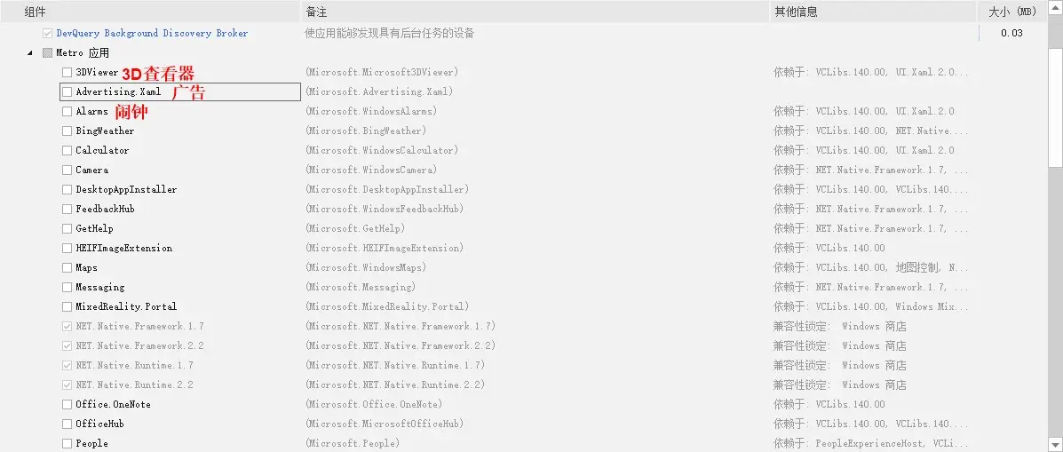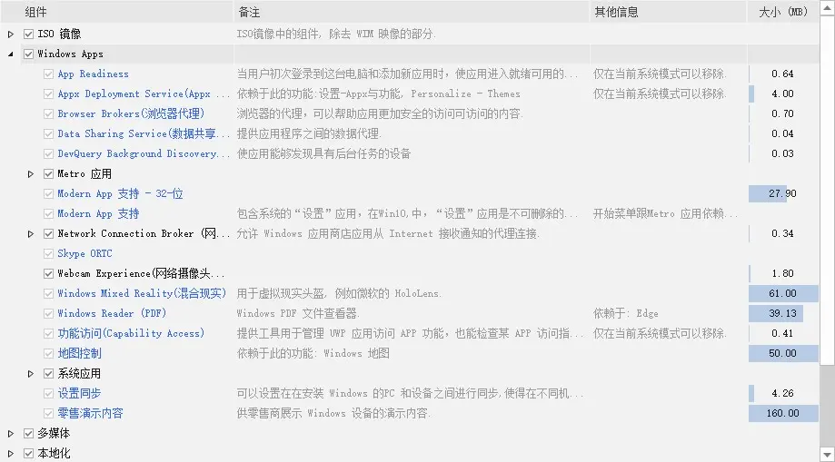 ”Windows App“组件下的 ”Metro 应用“中大多数是可以去除的,去除方法就是把选项前面的 ” √ “ 取消勾选